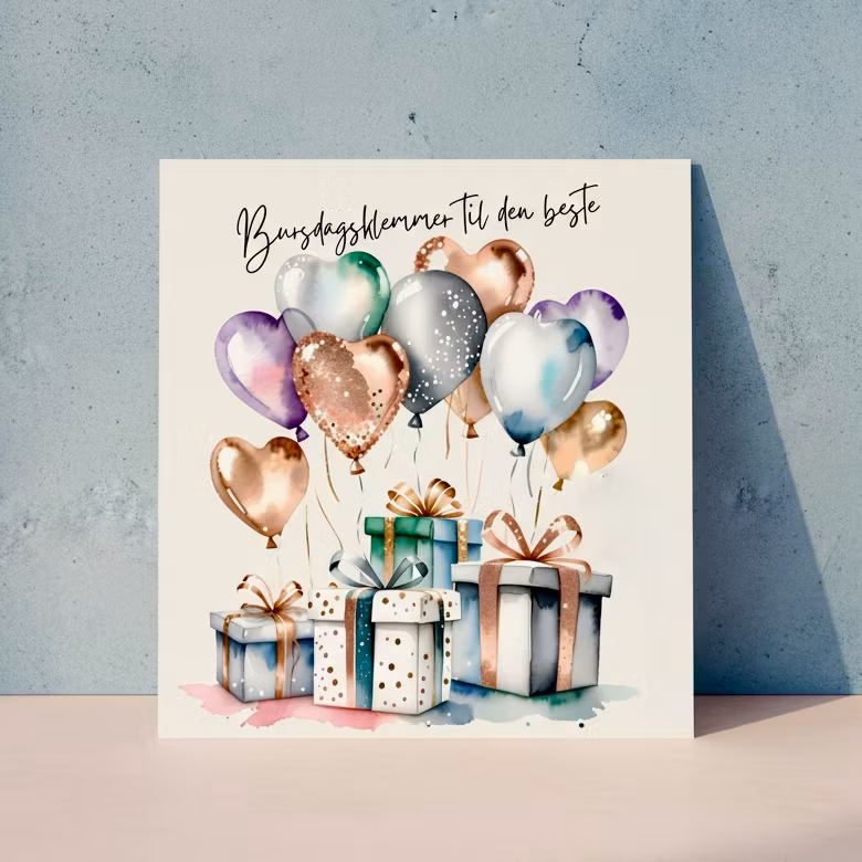 Nydelig bursdagskort med gaver og hjerteballonger.