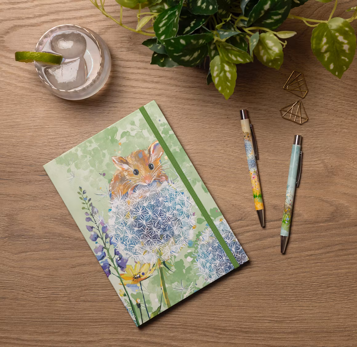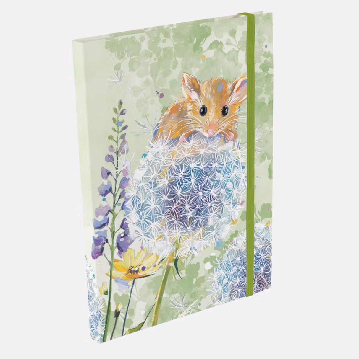 La tankene flyte fritt med denne vakre A5-notatboken, dekorert med et sjarmerende motiv av en liten mus blant lette løvetannfrø og blomster. Det myke, naturinspirerte designet gir en rolig og inspirerende følelse – perfekt for stille øyeblikk.