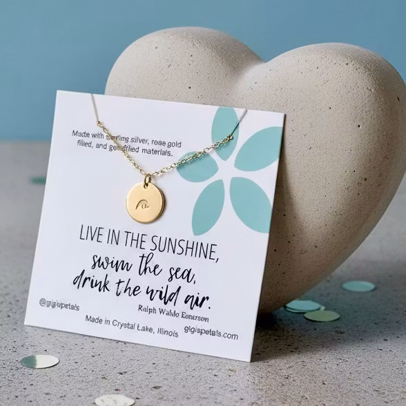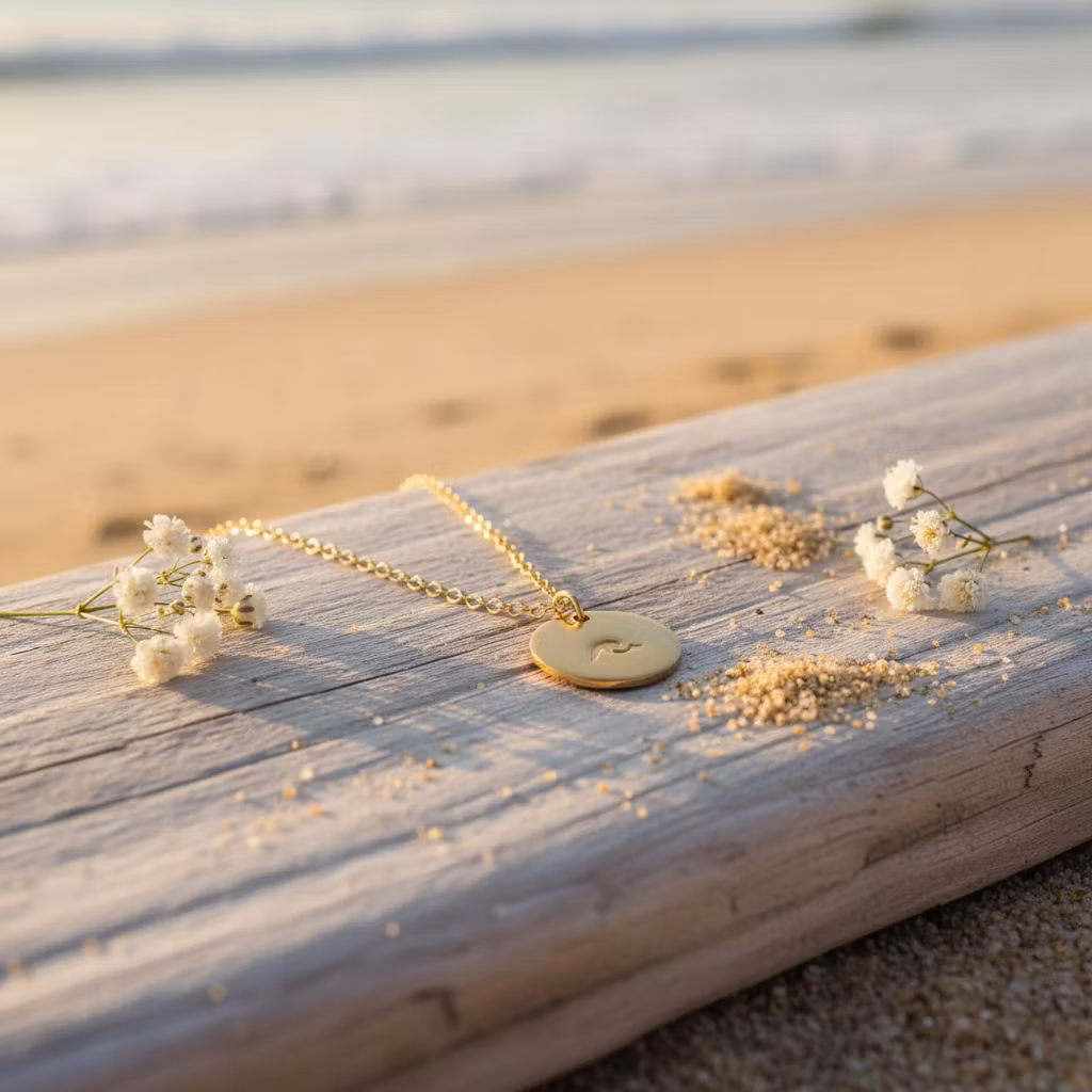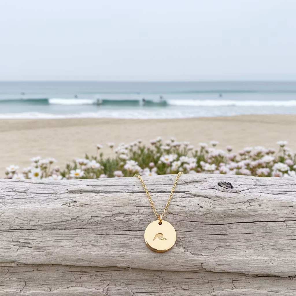 Et nydelig gullkjede med et rundt anheng (13 mm) preget med et bĂžlgesymbol â en pĂ„minnelse om balanse, frihet og styrke.