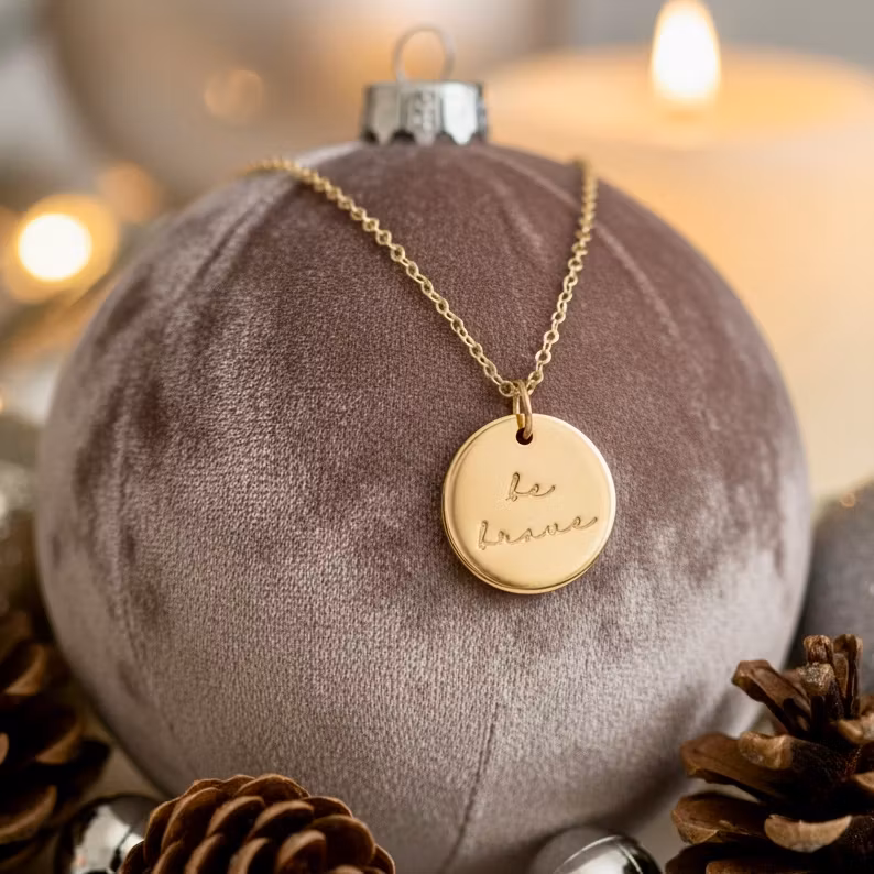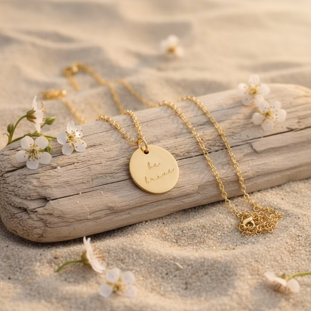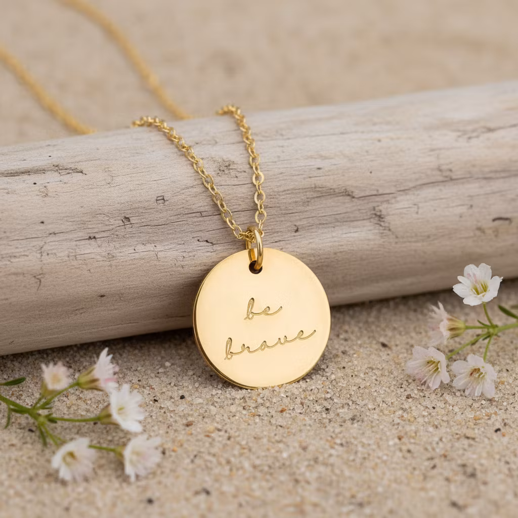 Et vakkert gullkjede med et rundt anheng (13 mm) inngravert med teksten “Be Brave” – en tidløs påminnelse om å møte livet med mot og styrke.