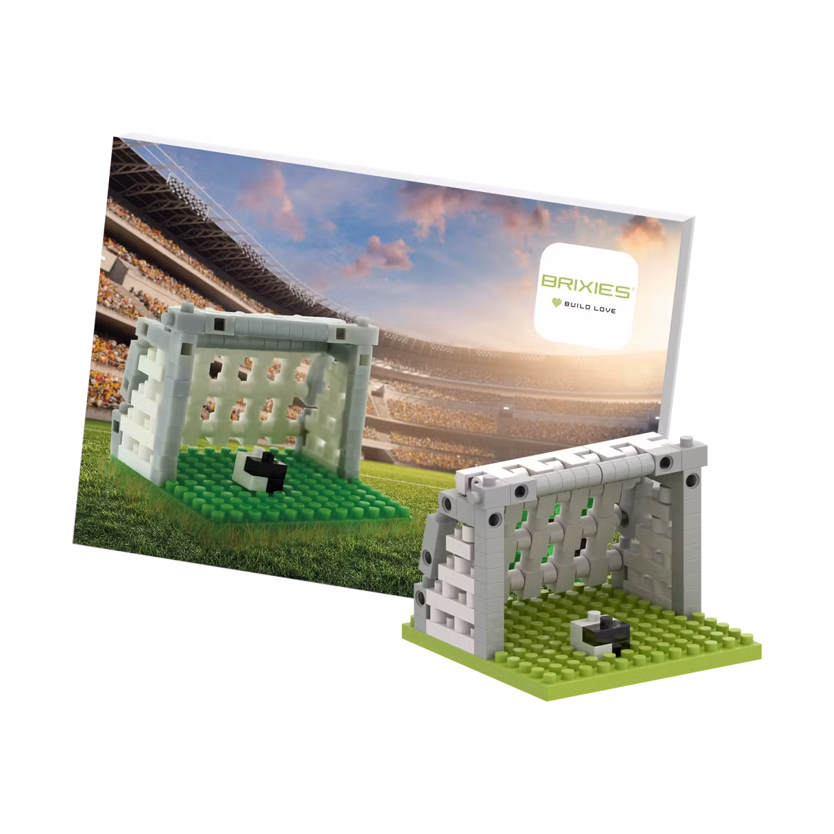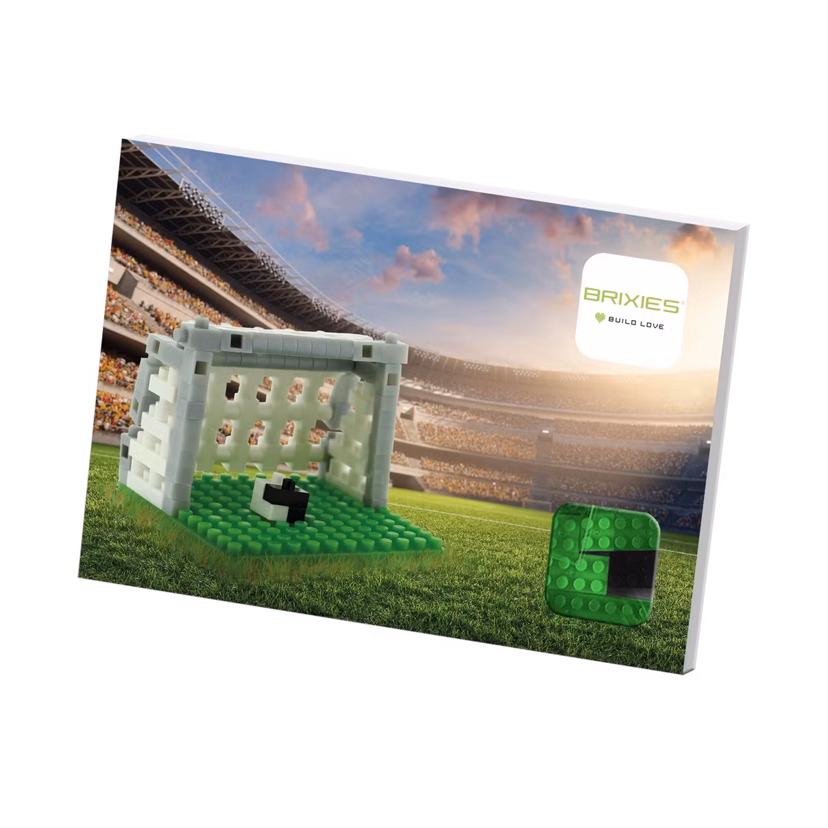 Med BRIXIES postkort får mottakeren ikke bare et kort, men også et lite byggeprosjekt – et miniatyr fotballmål komplett med ball. Perfekt for fotballelskere i alle aldre!