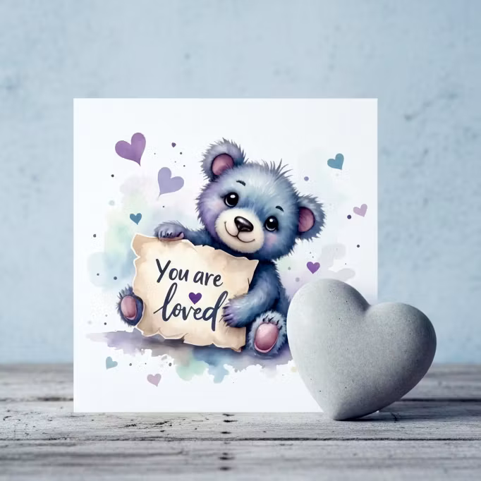 Dette hjertevarme kortet sprer omtanke og nærhet med sitt søte motiv av en myk liten bamse som holder et skilt med teksten “You are loved”. De duse fargetonene og de små hjertene gir et mildt og trøstende uttrykk – perfekt når du vil sende litt ekstra kjærlighet.
