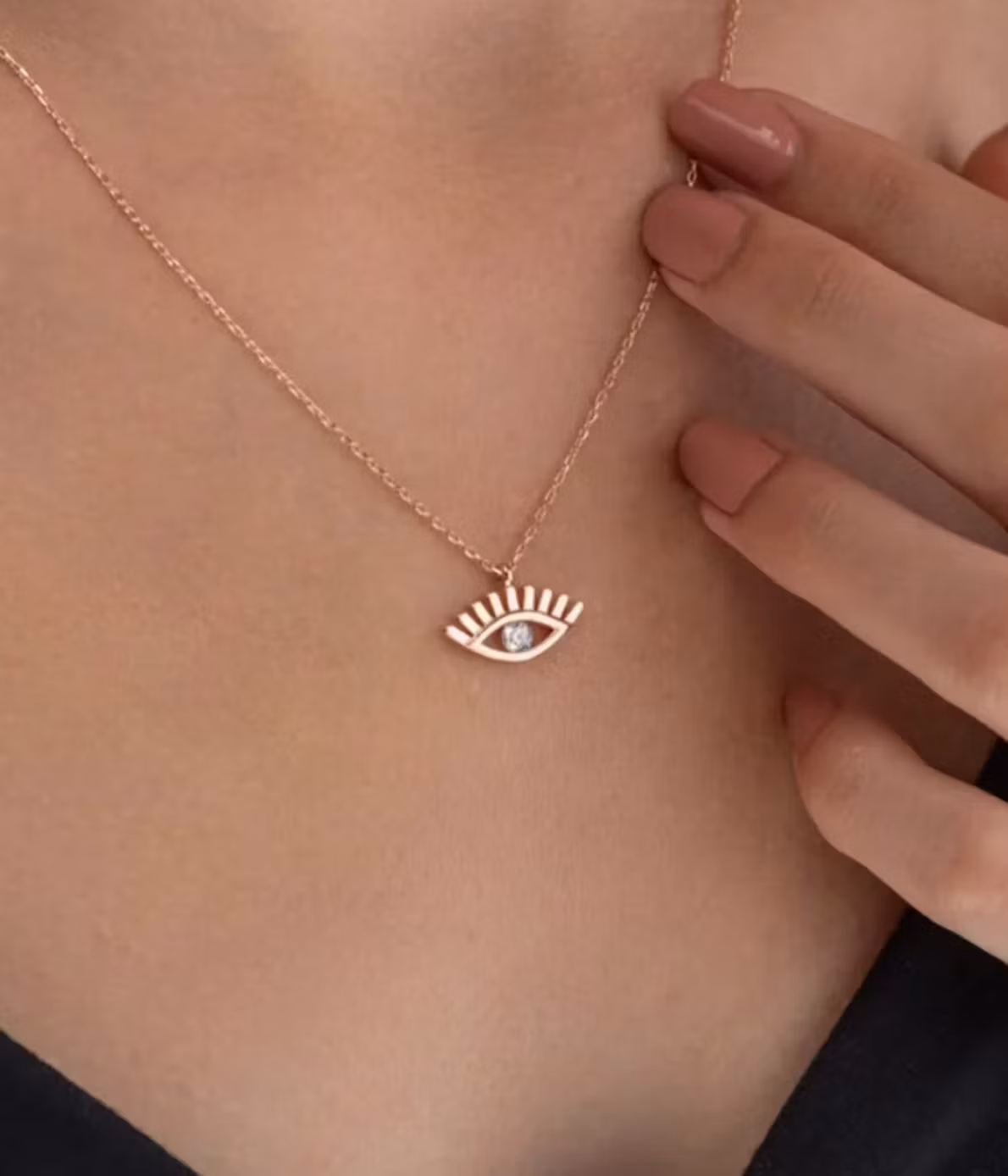 Einzelstück - Evil eye smykke, rosegull 349,- 150,- Produktet finnes dessverre ikke i lager. Del Informasjon Nydelig smykke i rose gullbelagt Sterling sølv. 43 cm kjede.