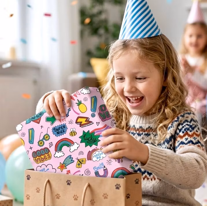 Spre glede og gode vibber med dette gavepapiret dekorert med positive budskap som Smile, Lucky, Will be ok og Super Nice. Inkluderer to ark og to etiketter med hyssing â en innpakning som blir en gave i seg selv.