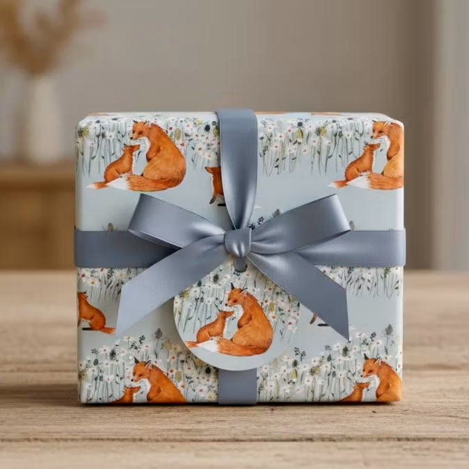 Gi gaven et sjarmerende preg med dette gavepapiret dekorert med lekne rever og blomster.