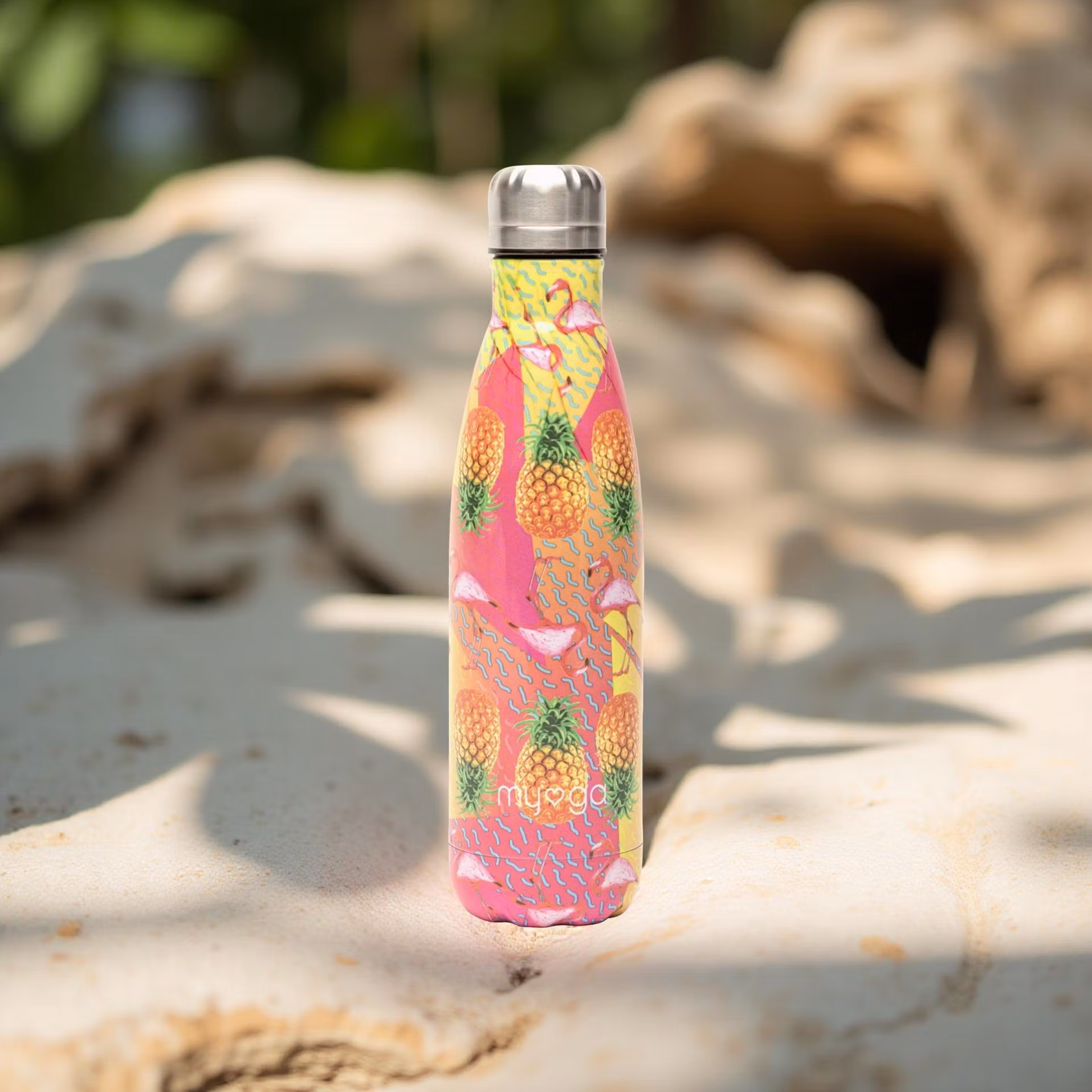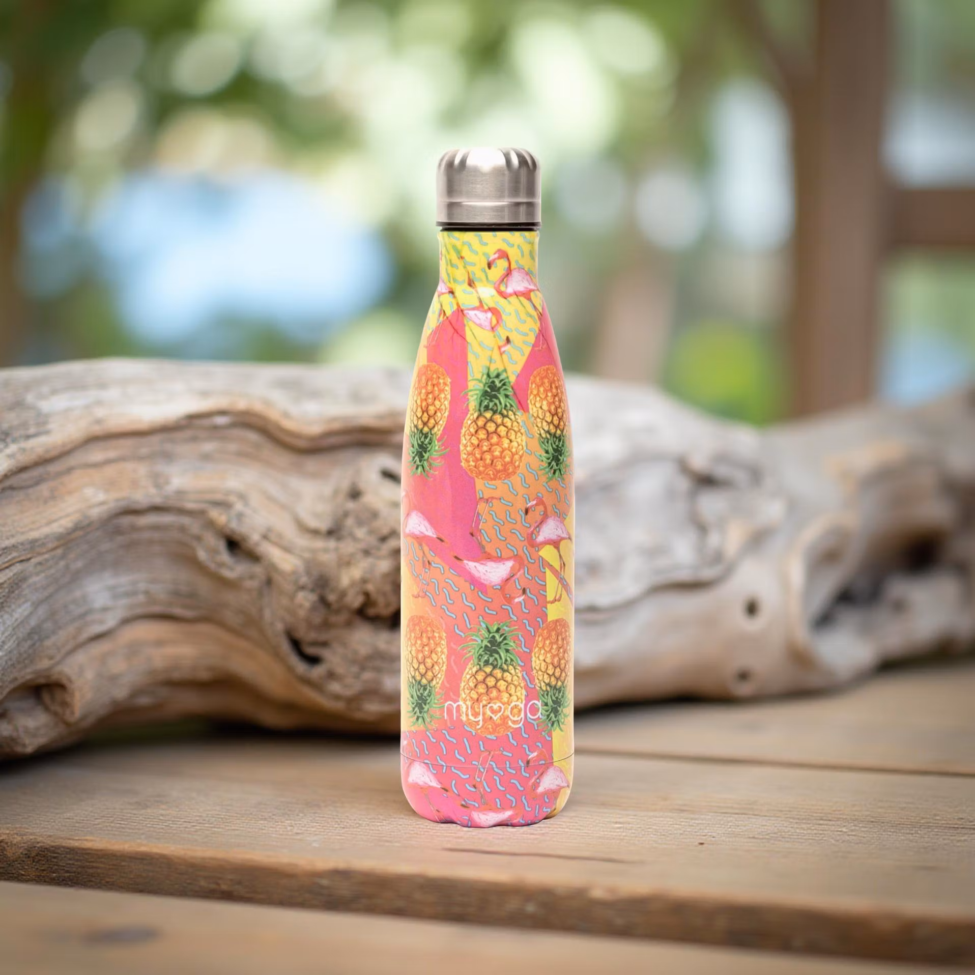 Designet med fargerike ananaser og flamingoer minner flasken deg på å holde hodet høyt og ta med sommerfølelsen på farten.