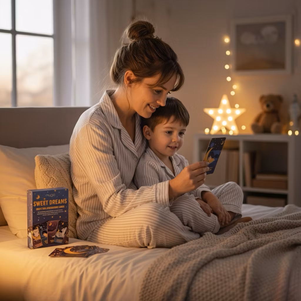 Kortene kan enten leses høyt av en forelder eller velges av barnet selv, og gjør leggetiden til et nærende øyeblikk av tilknytning og ro.