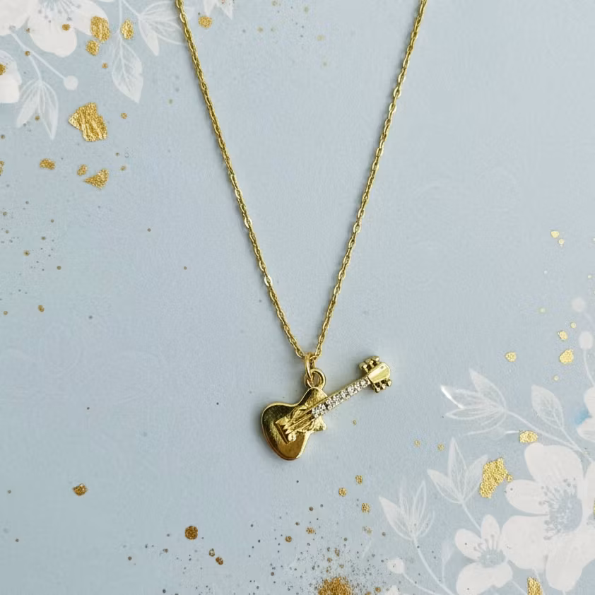 Gullkjede - Gitar 349,- 199,- På lager Legg i handlekurv Del Informasjon Gullkjede med gitar anheng. Gullbelagt messing. Lengde: 43-47cm