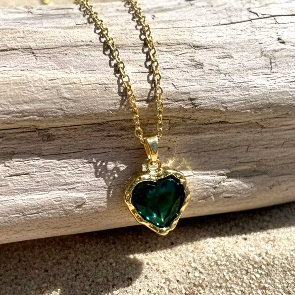 Dette elegante kjedet kombinerer luksus og romantikk i ett uttrykksfullt smykke. Det gullbelagte rustfrie stålet gir en varm, eksklusiv glans, mens hjertet i dypgrønn Cubic Zirconia skaper et strålende, edelstenslignende skimmer som virkelig fanger lyset. Den lett bølgete, organiske innfatningen gir smykket et unikt og håndlaget preg.