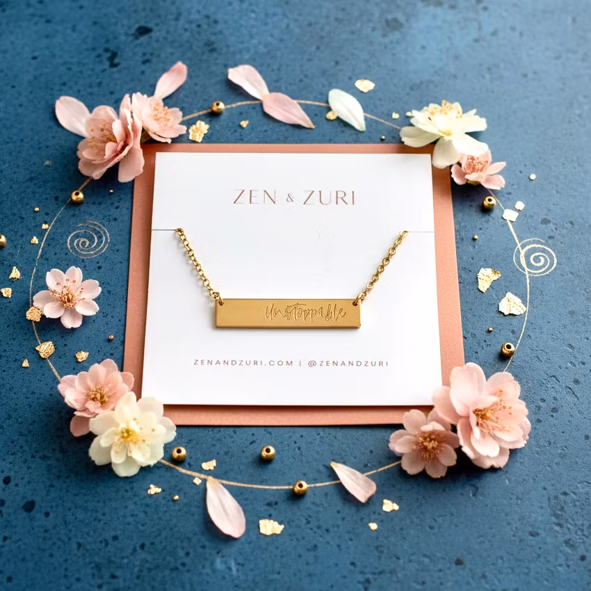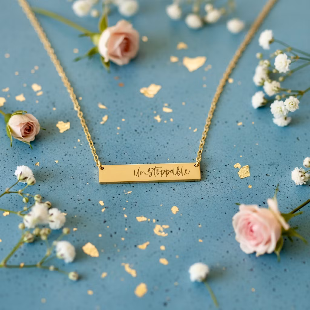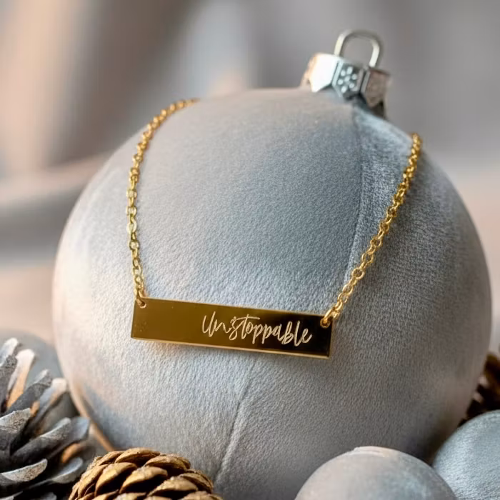 Gold necklace with "Unstoppable" engraved on the gold bar.