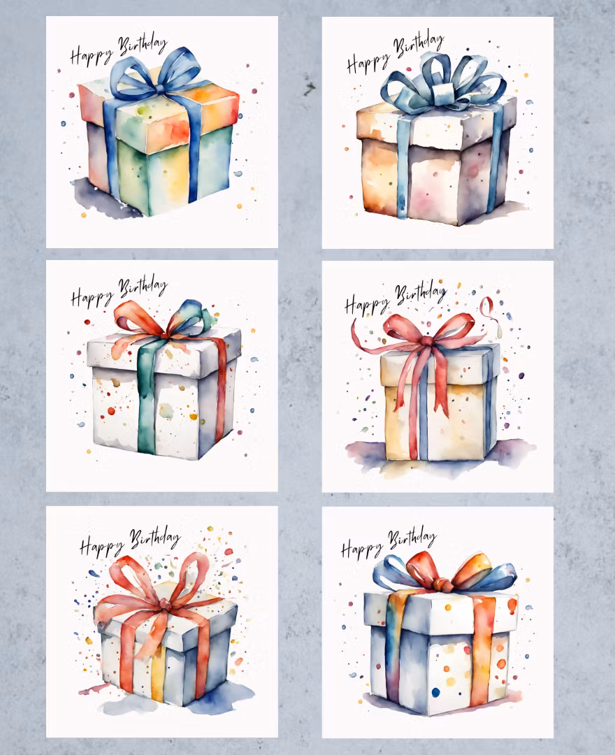 Kortene har ulike, fargerike gave-motiv og teksten “Happy Birthday” – perfekte for å spre glede på den store dagen.