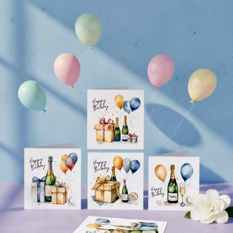 Kortene kommer med lekne motiver av bobler og ballonger – og teksten “Happy Birthday” som setter den perfekte stemningen for feiringen.