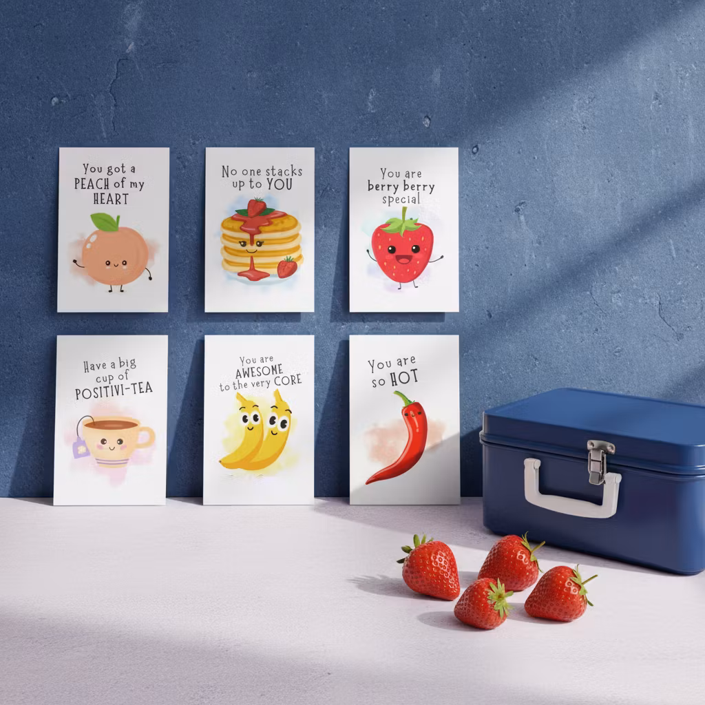 Hvert kort har unike motiver inspirert av frukt og snacks – alle med kreative og humoristiske ordspill som sprer glede.