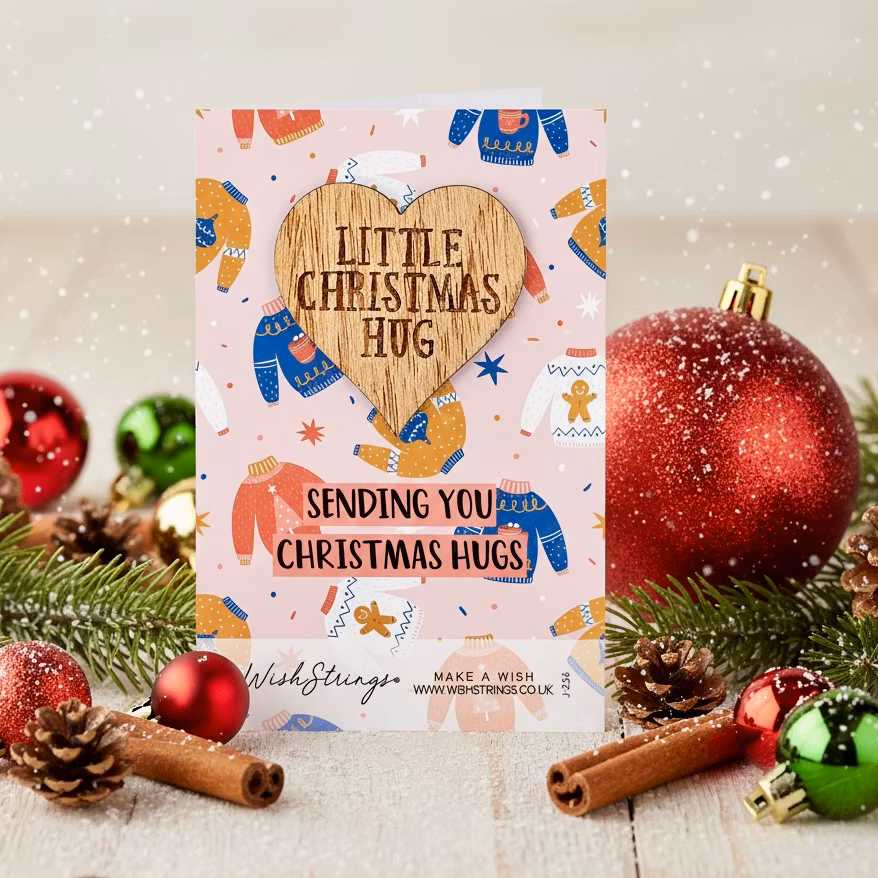 A Oak carved token presented on a beautifully designed Card with the text: "Sending You Christmas Hugs"