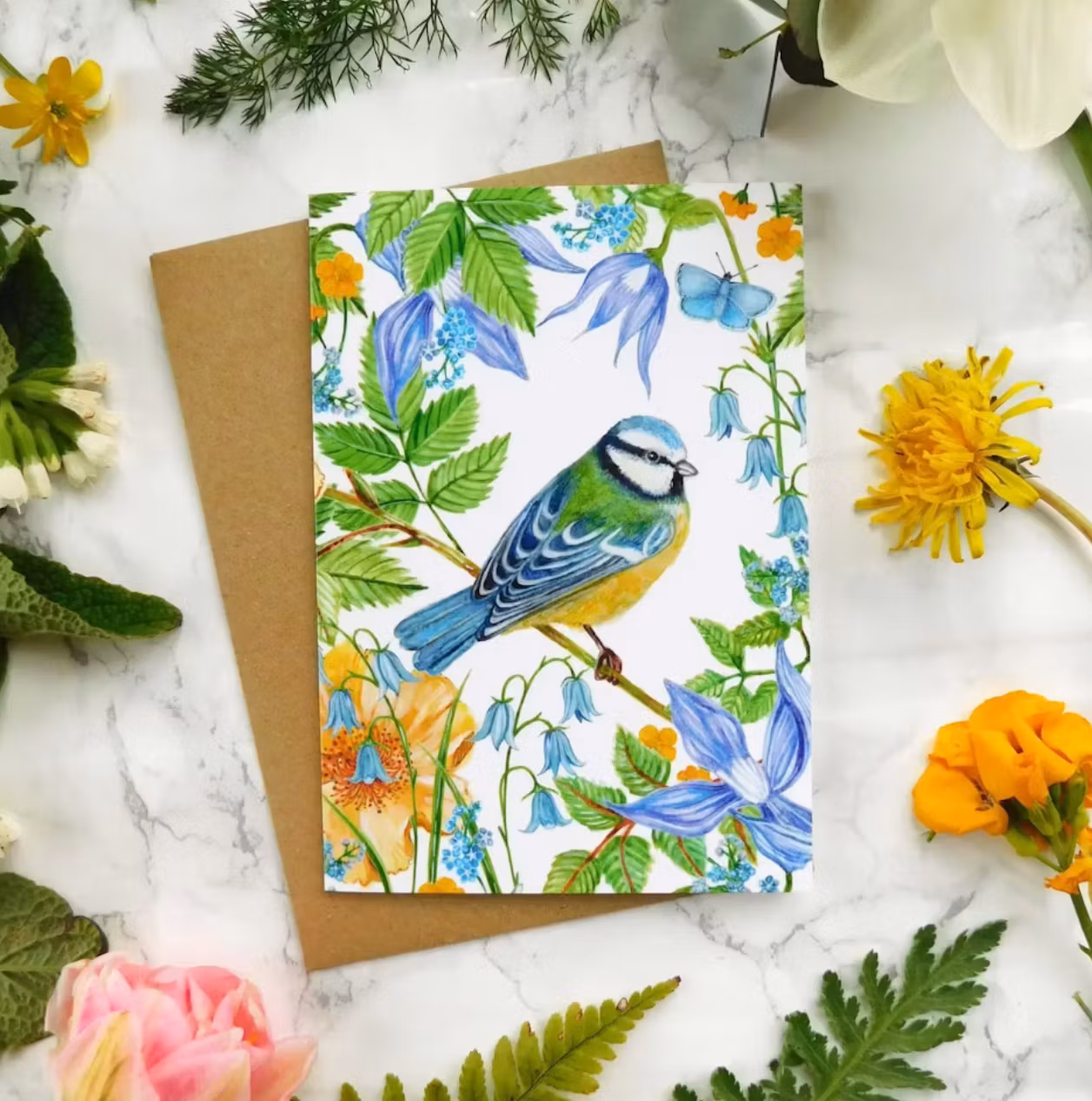 En nydelig måte å sende en hilsen på med fin blåmeis. Blank innside for hilsen.