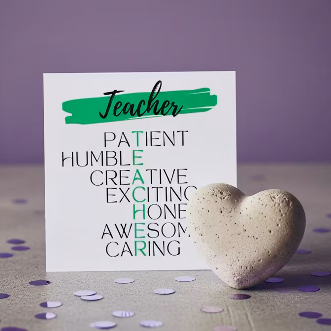 Kortet har et stilrent design med teksten Teacher og positive ord som patient, humble, creative, exciting, honest, awesome og caring. Perfekt som en hyggelig hilsen ved skoleavslutning, som takk for innsatsen eller bare for å vise hvor verdsatt læreren er.