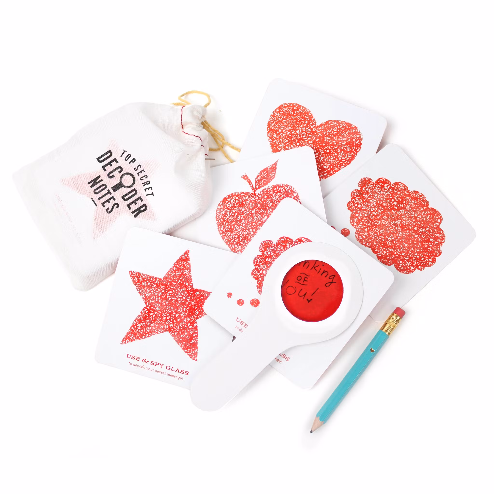 Write lightly with a pencil or blue pen, then peek through the red decoder lens to reveal your hidden message!