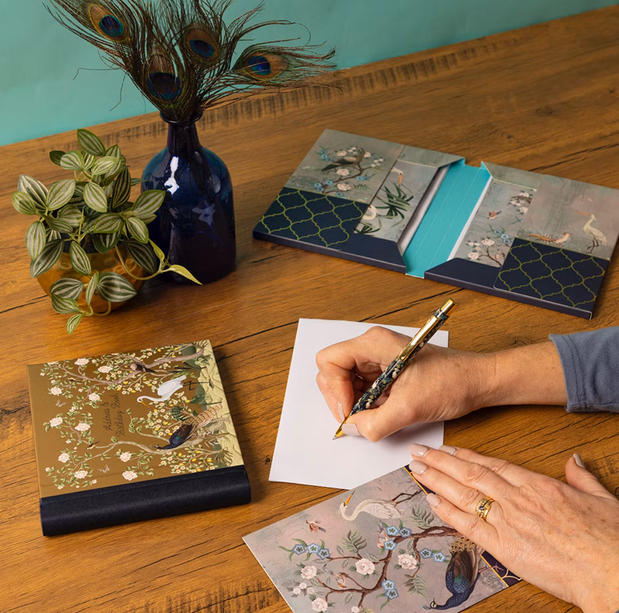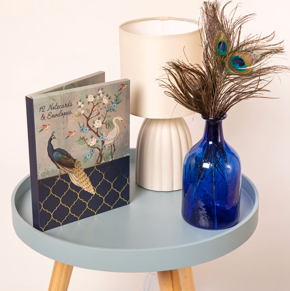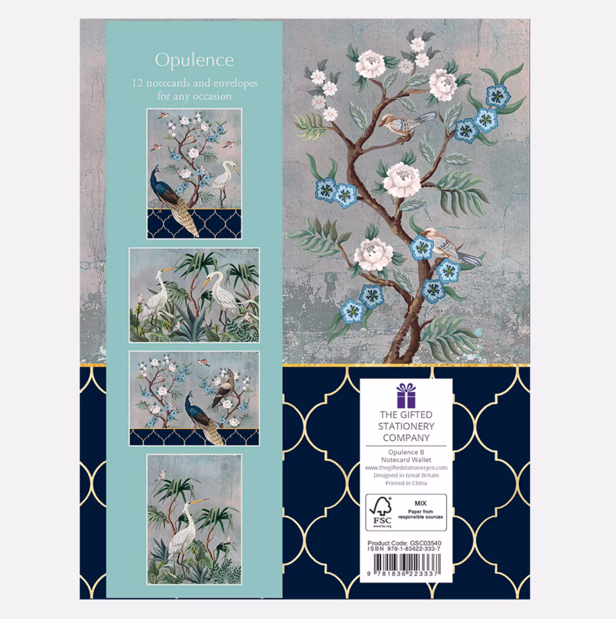 Med denne vakre kortmappen har du alltid et sofistikert kort klart til enhver anledning. Designet kombinerer majestetiske fugler som påfugl og hegre med delikate blomstergrener i harmoniske fargetoner – perfekt for et eksklusivt og tidløst uttrykk.