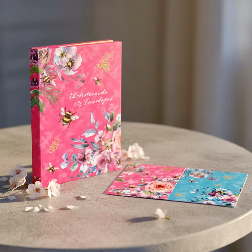 Et sjarmerende kortsett inspirert av naturens egne små hjelpere. Denne kortmappen inneholder 12 kort fordelt på 4 ulike design, alle med vakre illustrasjoner av bier og blomster.