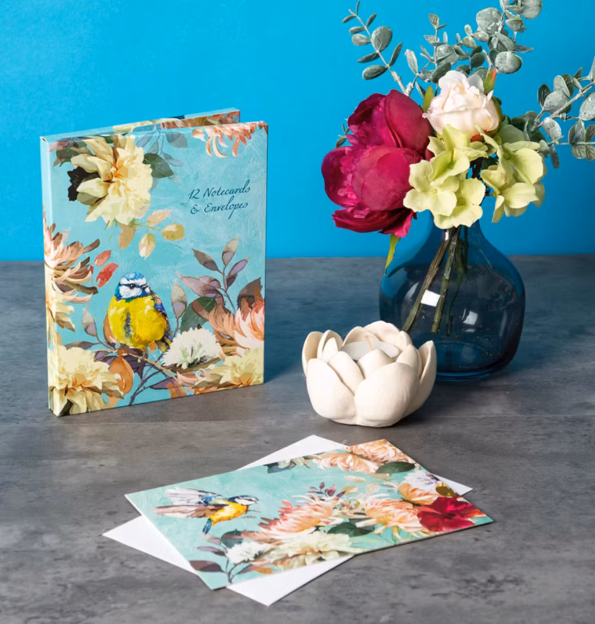 Mappen inneholder 12 kort fordelt på 4 unike og elegante design, alle med nydelige motiver av fugler og blomster som gir en tidløs og elegant uttrykk.