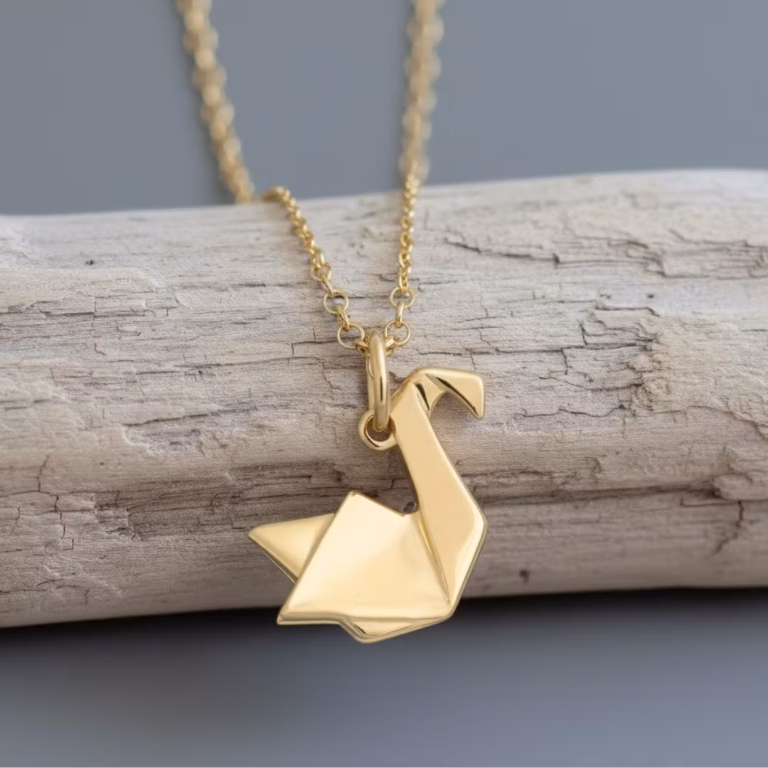 Lily Charmed gold plated origami swan necklace makes a great addition to our origami jewellery range. Crafted from 925 sterling silver and plated in 18ct gold this stunning swan charm features smooth polished surfaces with angular edges to mimic the folds of paper and giving it a subtle geometric style.