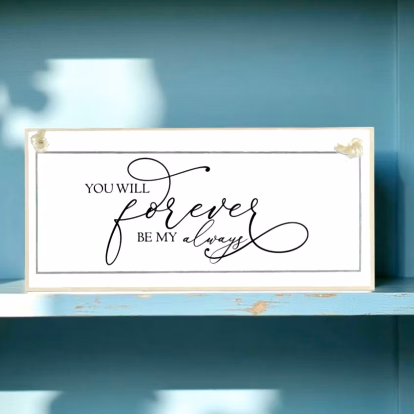 Crafty Clara Wooden Sign - "You will Forever be my Always" 99,- På lager Legg i handlekurv Del Informasjon "You will Forever be my Always"Handmade Shabby Chic Sign. Approx' 20cm x 9.5cm and 12mm thick Recommended for indooruseMade in United Kingdom