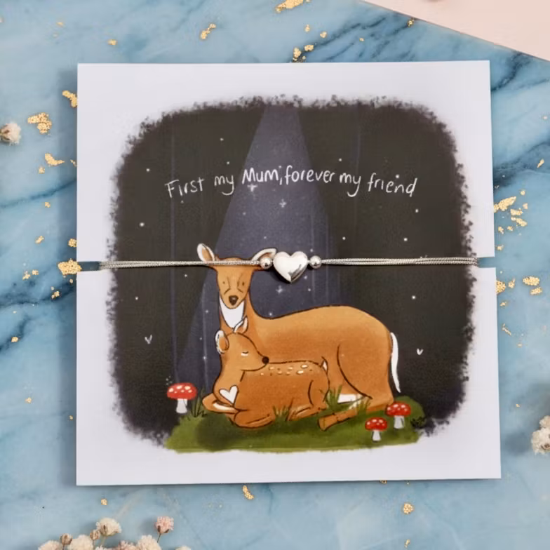 A sparkly heart bracelet that comes with a card featuring a deer and her fawn, cuddled together under the night sky to symbolise an unbreakable bond. The perfect token gift for mum to show your love and appreciation.