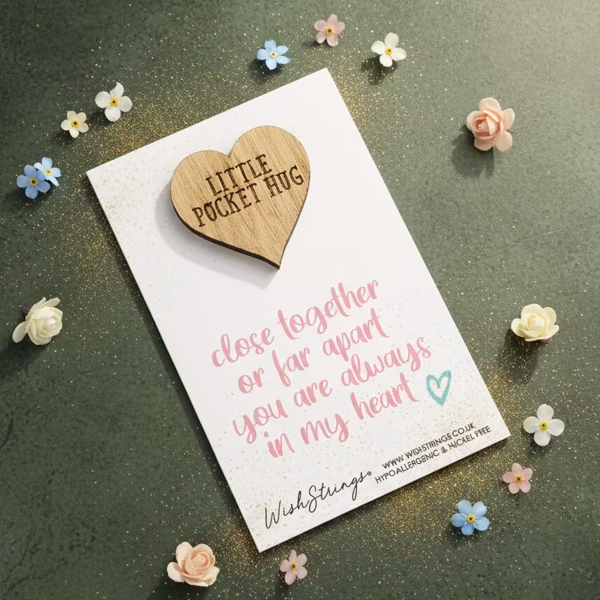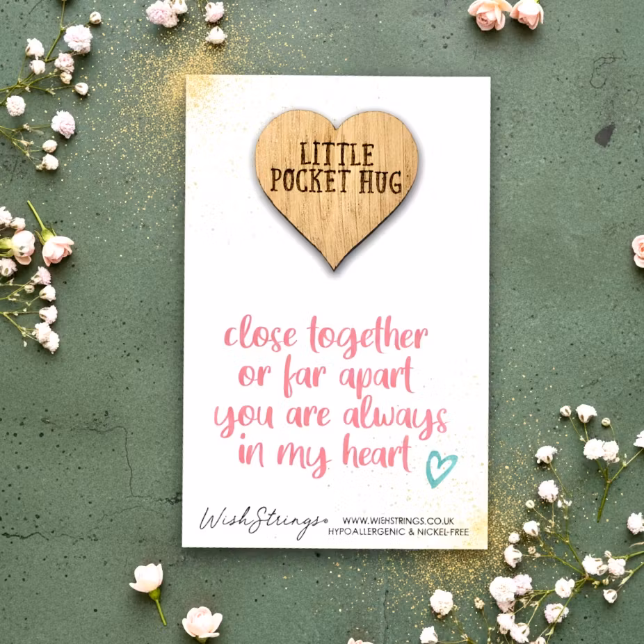 A Oak carved token presented on a beautifully designed Card with the text: "Close together or far apart, you are always in my heart"