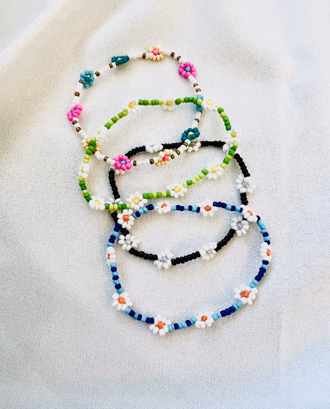 Søtt, enkelt armbånd med plastikk perler med små blomster. Perfekte både alene og lag-på-lag med andre armbånd