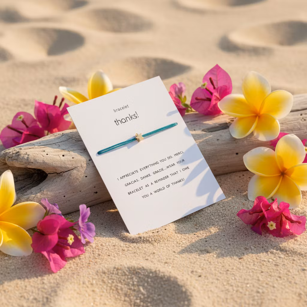 "I appreciate everything you do. Mercy. Gracias. Danke. Grazie...Wear you bracelet as a reminder that I owe you a world of thanks"