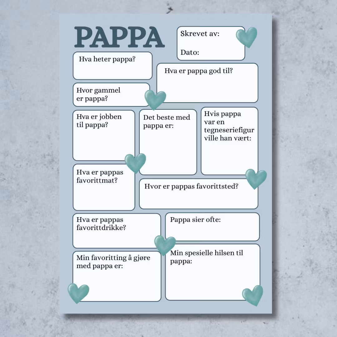 Kortet inviterer barnet til å sette ord på hva pappa betyr for dem, og resultatet blir et minne som ofte tas vare på for alltid. Perfekt som gave til farsdag, bursdag, jul – eller bare for å si «jeg er glad i deg».