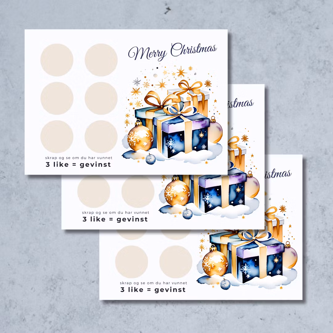 Dette unike juleskrapeloddet gir mottaker en morsom måte og åpne sin julegave på! I de tomme feltene skriver du inn ulike ting som potensielle kan være en gave. Det du faktisk skal gi i gave skriver du på 3 av feltene. Når mottaker skraper alle feltene finner de ut hva de får i gave. Her er det bare oppfinnsomheten på de potensielle gavene som stopper deg. F.eks kan 2 av feltene være en Ferrari, en jorden rundt reise eller en million kroner :)