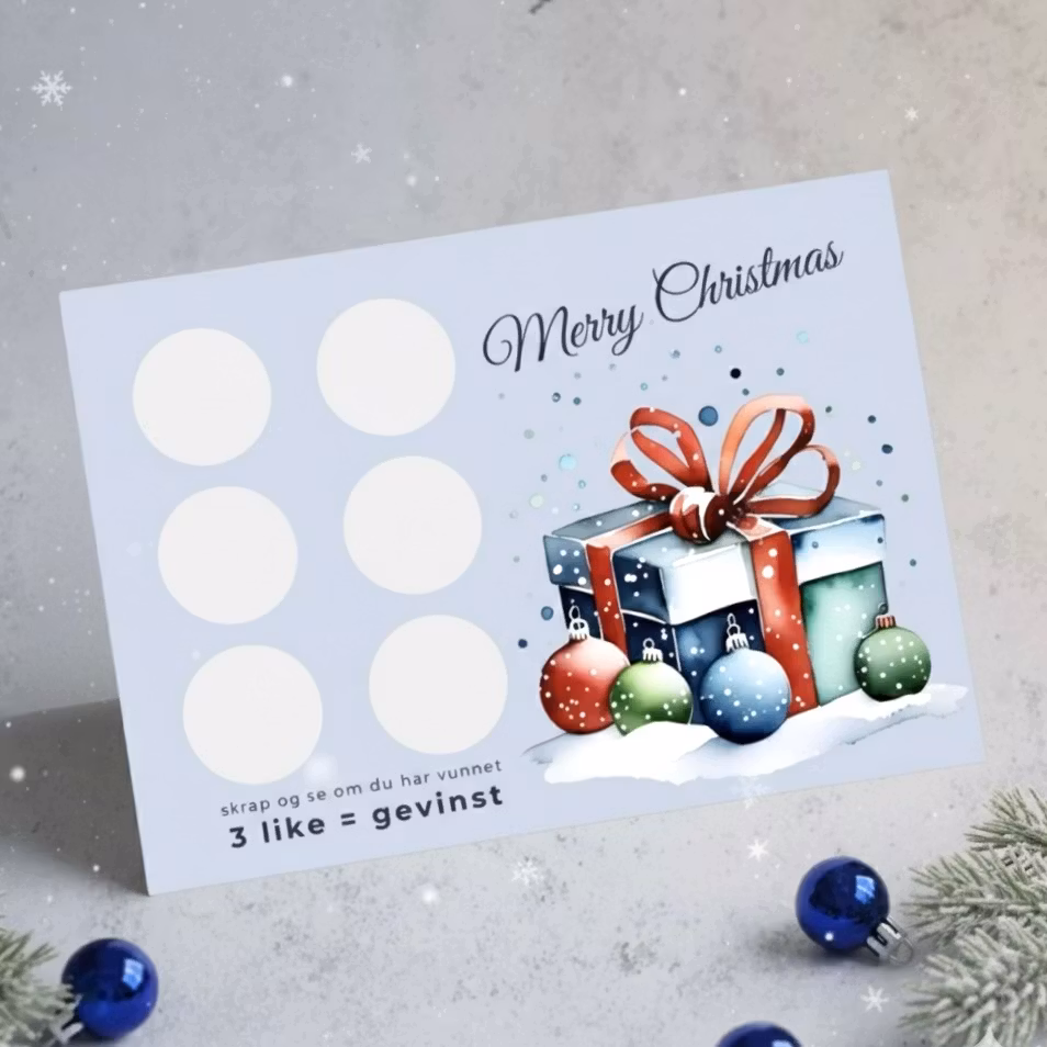 Dette unike juleskrapeloddet gir mottaker en morsom måte og åpne sin julegave på! I de tomme feltene skriver du inn ulike ting som potensielle kan være en gave. Det du faktisk skal gi i gave skriver du på 3 av feltene. Når mottaker skraper alle feltene finner de ut hva de får i gave. Her er det bare oppfinnsomheten på de potensielle gavene som stopper deg. F.eks kan 2 av feltene være en Ferrari, en jorden rundt reise eller en million kroner :)