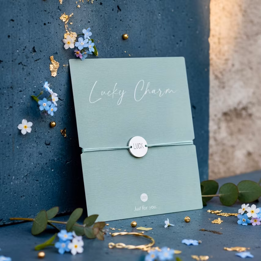 A simple bracelet on a pastel-coloured card brings good luck with it.