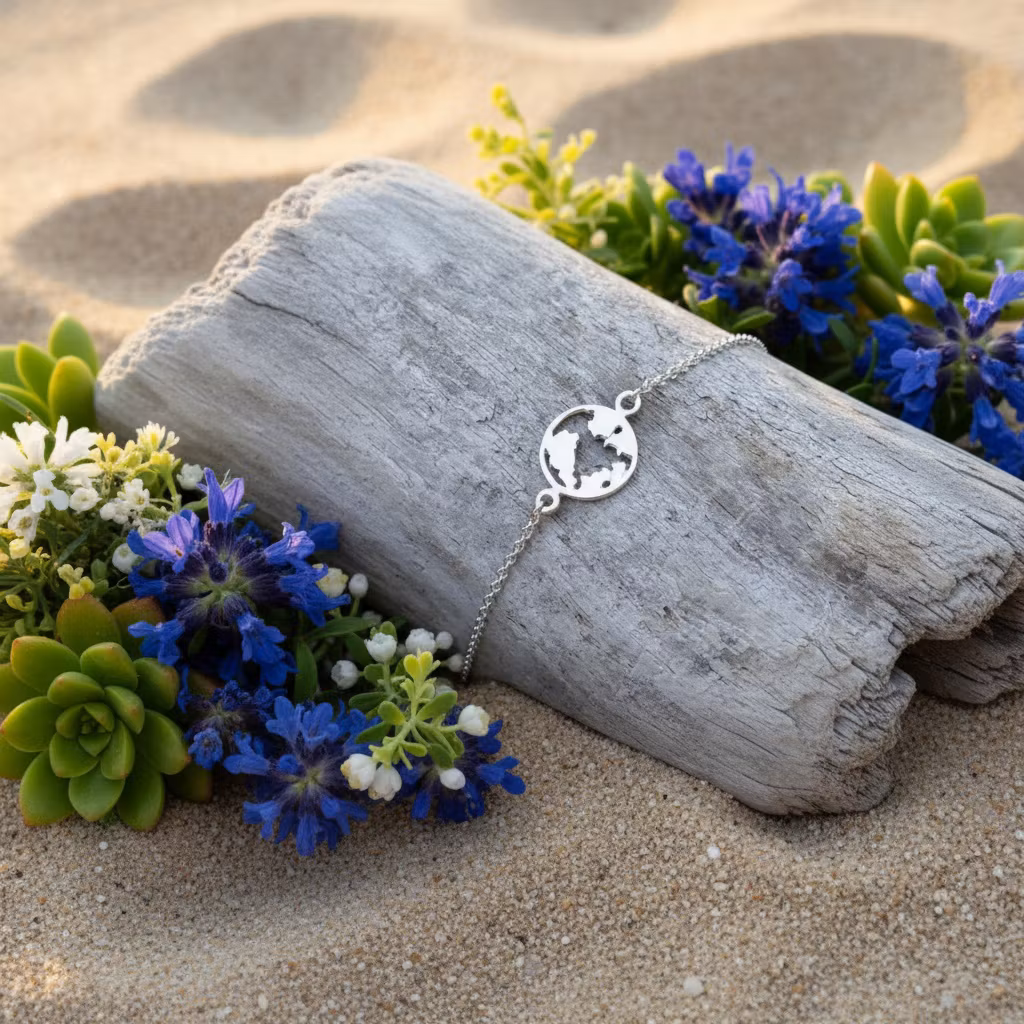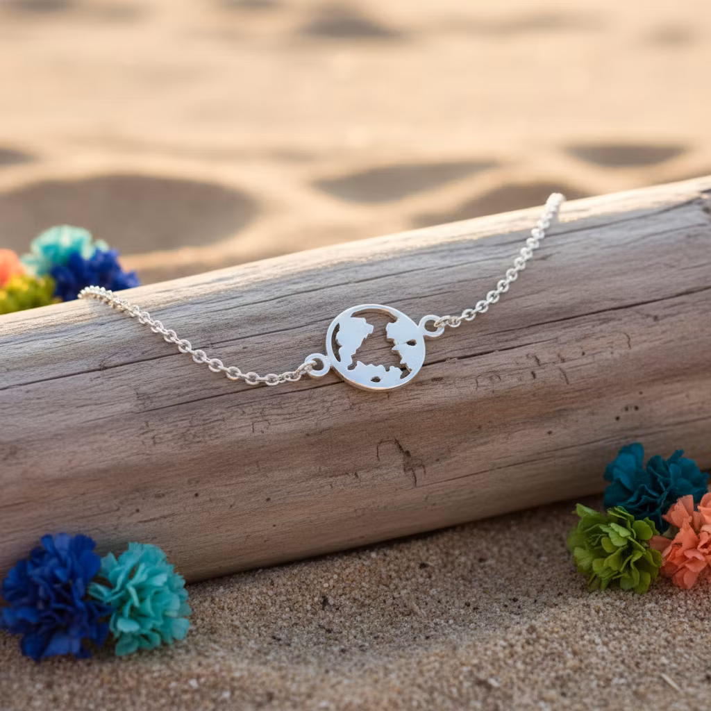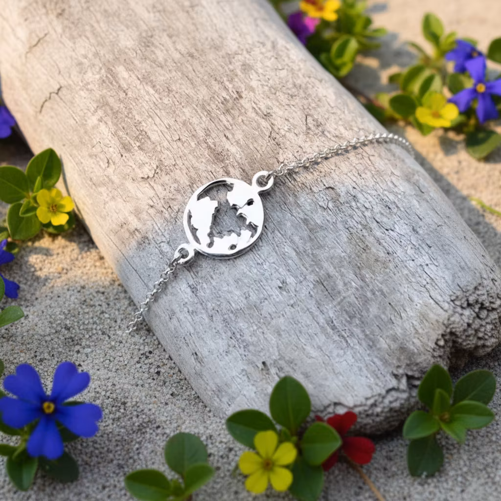 Bali Bliss Armbånd -Sølvarmbånd - World 199,- På lager Legg i handlekurv Del Informasjon Nydelig armbånd I 100% Sterling silver.Design: World mapBali Bliss Bracelett er håndlaget på Bali, Indonesia