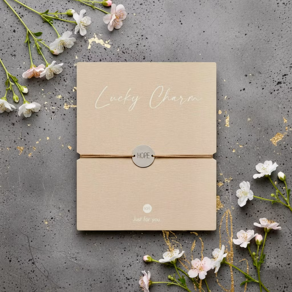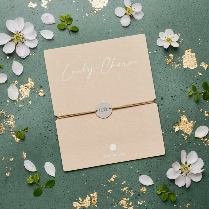 A simple bracelet on a pastel-coloured card brings good luck with it.