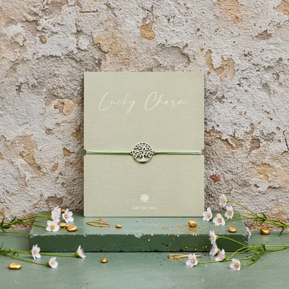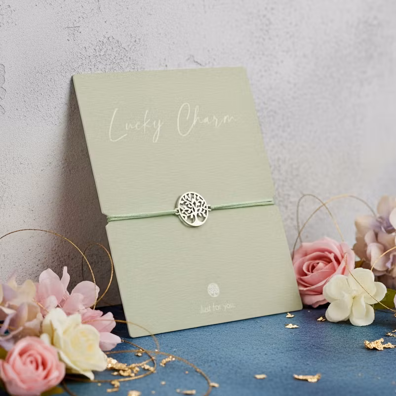 A simple bracelet on a pastel-coloured card brings good luck with it.