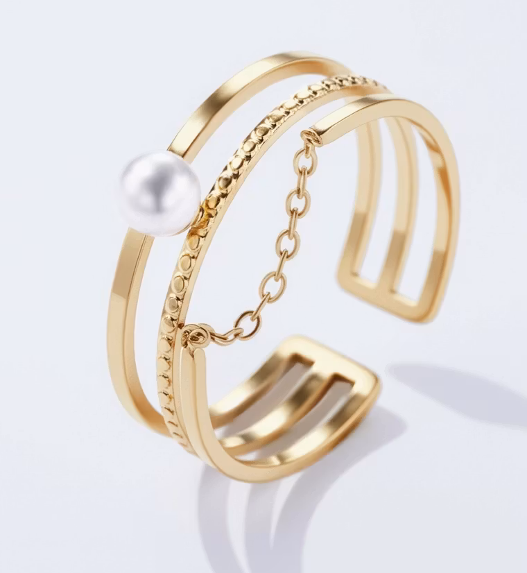 Denne ringen kombinerer flere nydelige detaljer i ett uttrykk. Den åpne, tredelte bøylen gir et luftig og moderne design, mens det fine kjedet skaper en eksklusiv og gjennomført look. Den glansfulle perlen tilfører mykhet og femininitet – en perfekt balanse mellom trendy og tidløs.