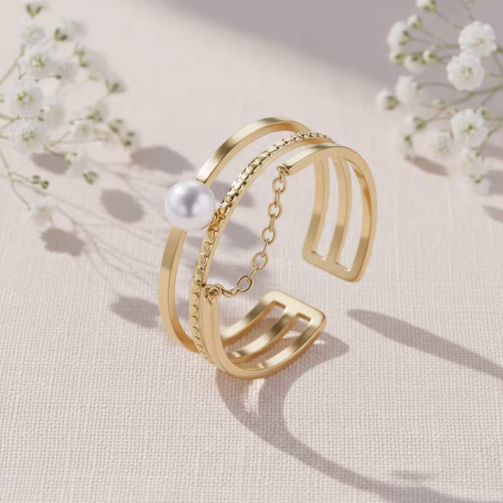 ✨ Justerbar Gullring med Perle & Kjededetalj – Moderne Eleganse