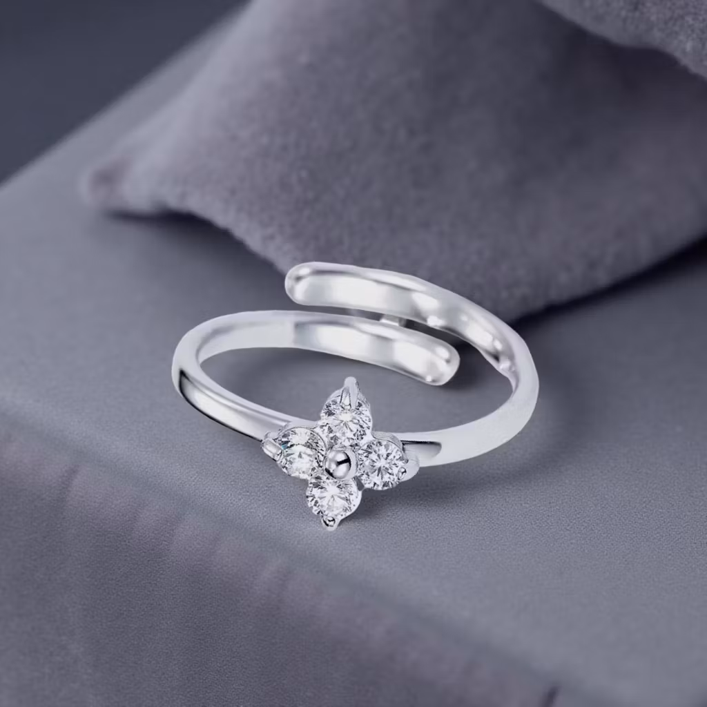 Denne nydelige ringen i sølvfinish har et elegant og feminint uttrykk. Midtpunktet er en blomsterformet detalj, satt sammen av fire glitrende steiner som fanger lyset og gir et mykt, skimrende skinn. Det åpne, justerbare designet gjør ringen behagelig å bruke og enkel å tilpasse enhver finger.