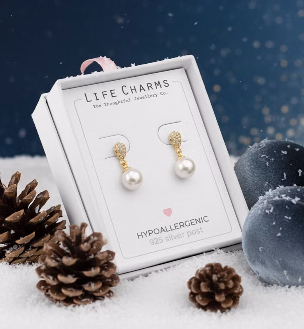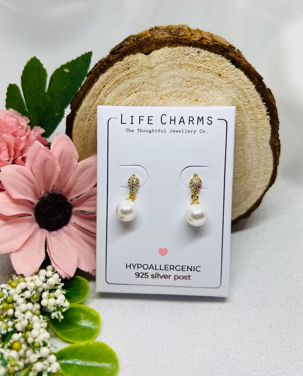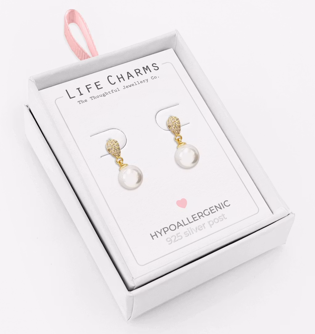 Life Charms - Pearl Drop Øredobber 219,- 149,- Produktet finnes dessverre ikke i lager. Del Informasjon Nydelige gullbelagte perleøredobber.Hypoallergenisk.
