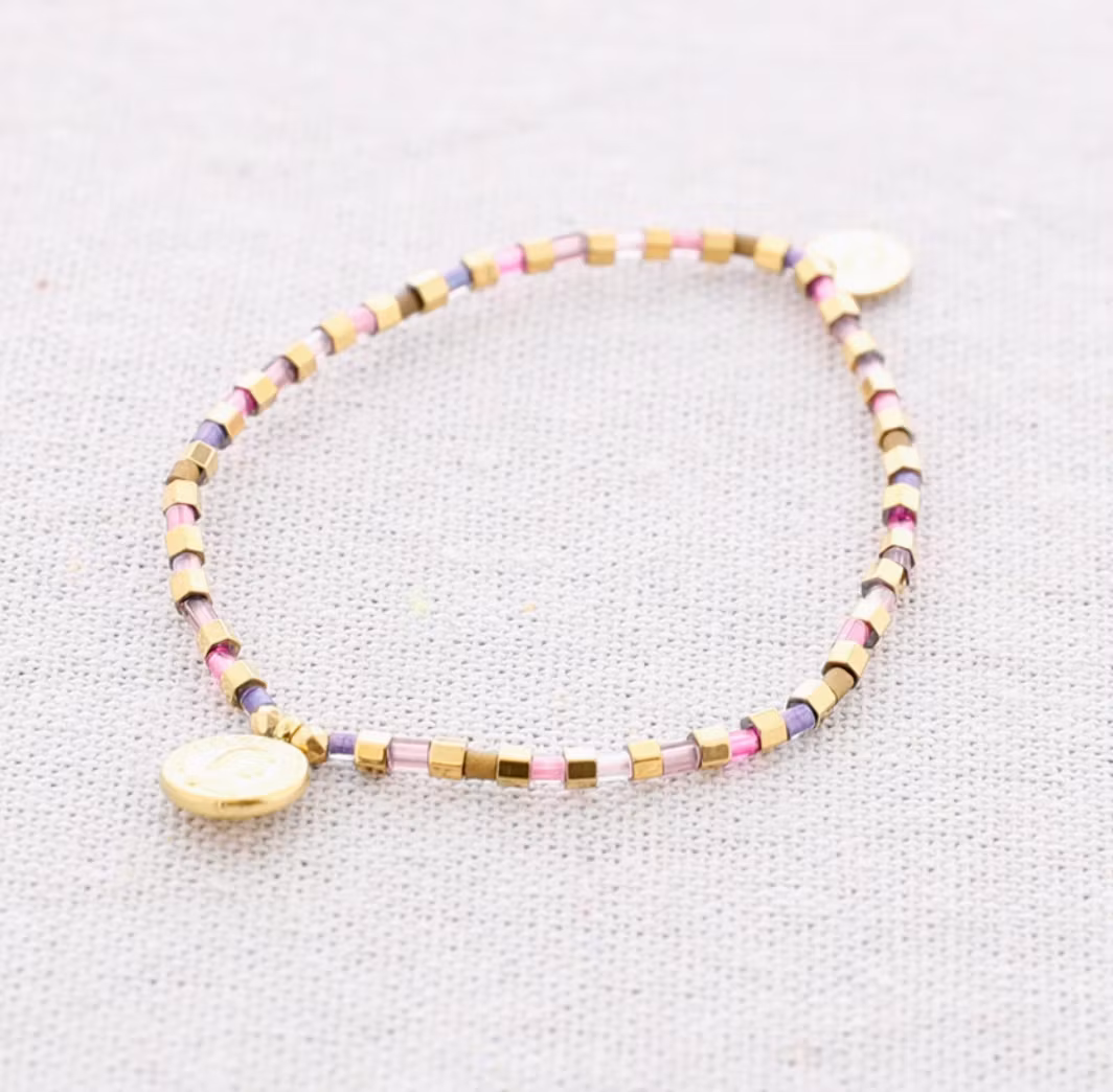 Dette nydelige armbåndet er laget av små, eksklusive Miyuki-perler i myke rosa- og lillatoner, kombinert med gullfargede kubesperler som gir en elegant og moderne glans. Resultatet er et feminint, lett og stilrent uttrykk – perfekt for deg som liker subtil eleganse med et hint av farge.