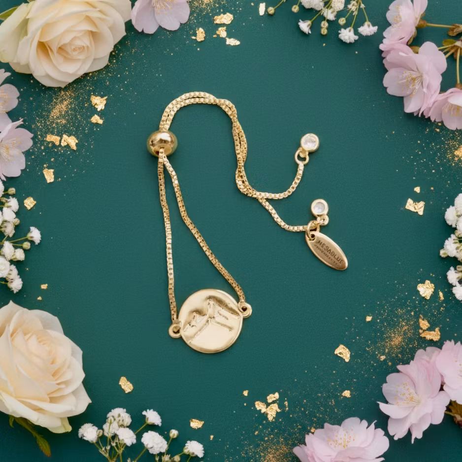 Mesa Blue - Stamped Mountain Coin Adjustable Bracelet 299,- På lager Legg i handlekurv Del Informasjon Adjustable BraceletChain: Gold plated over brassCoin: 24k gold - 14x19mmMade in United States