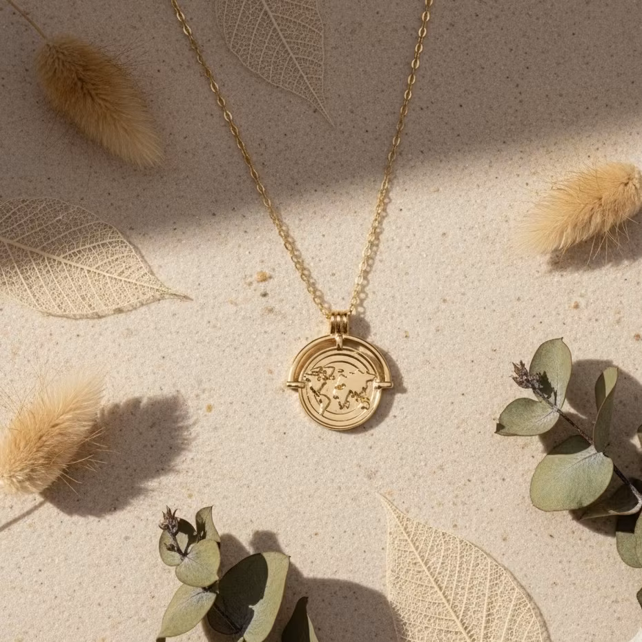 - 14k gold filled world/globe medallion pendant on 14k gold filled cable chain.