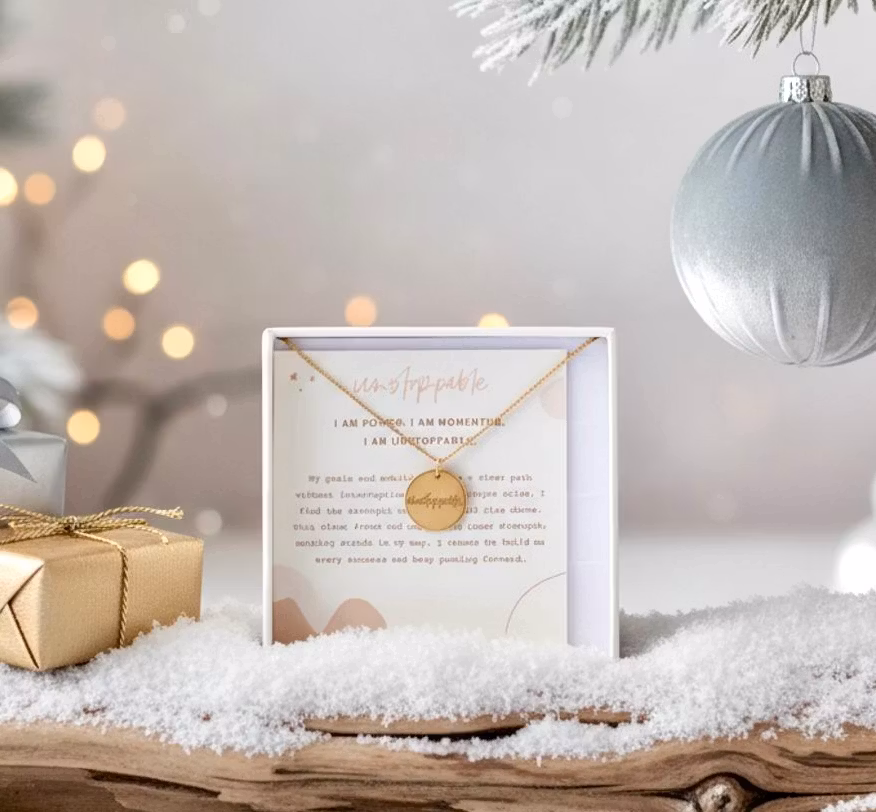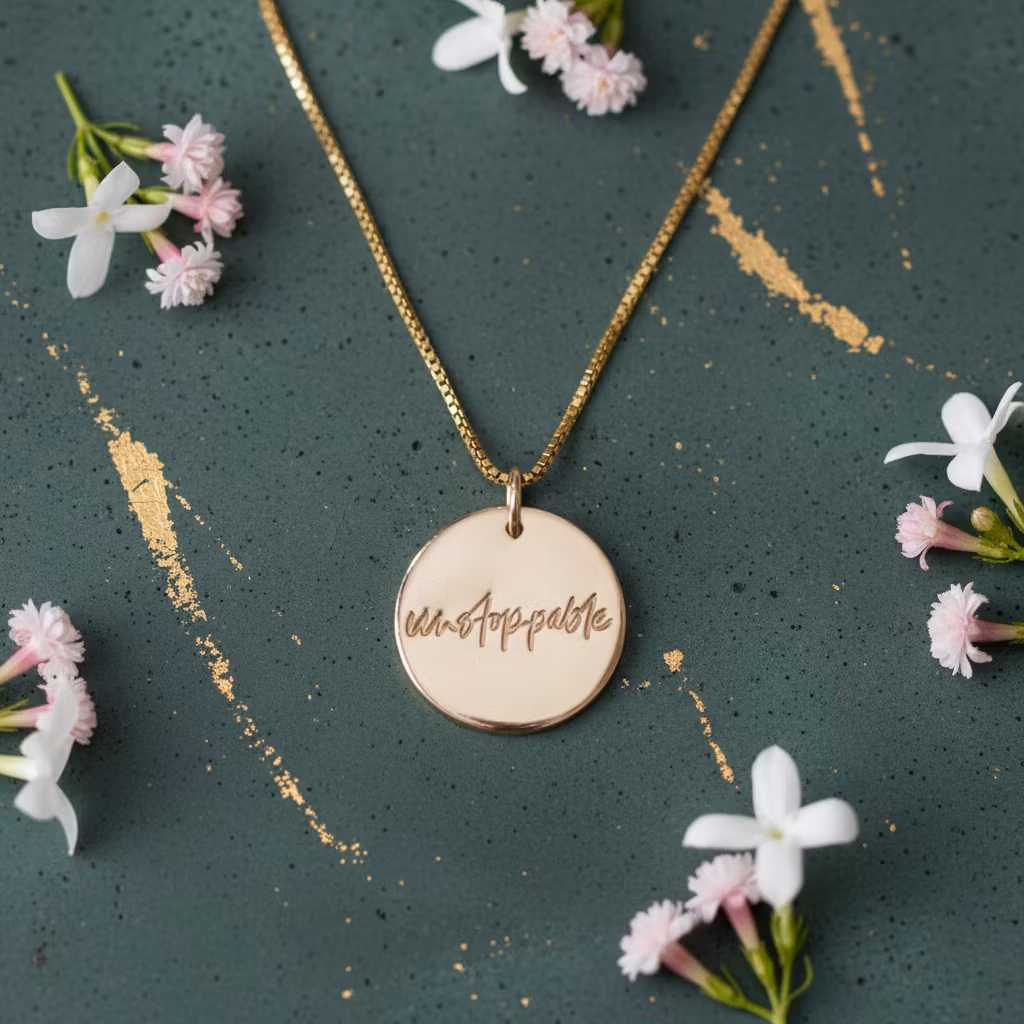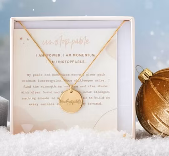 Et nydelig 14k gullbelagt kjede med teksten "Unstoppable! inngravert.