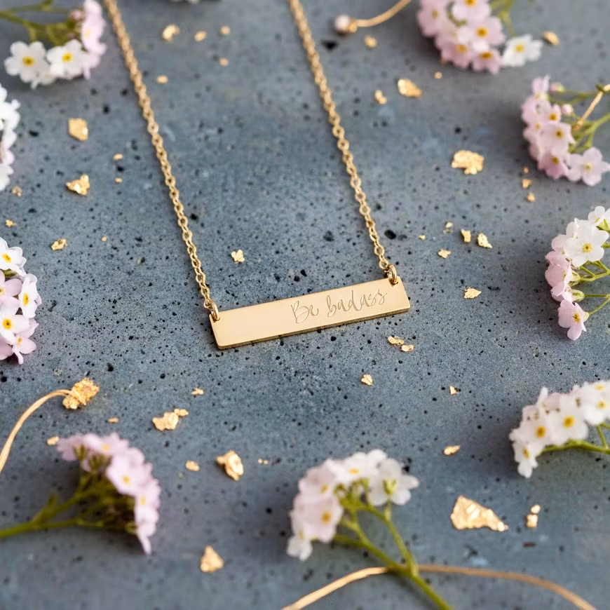 Gold necklace with "Be badass" engraved on the gold bar.
