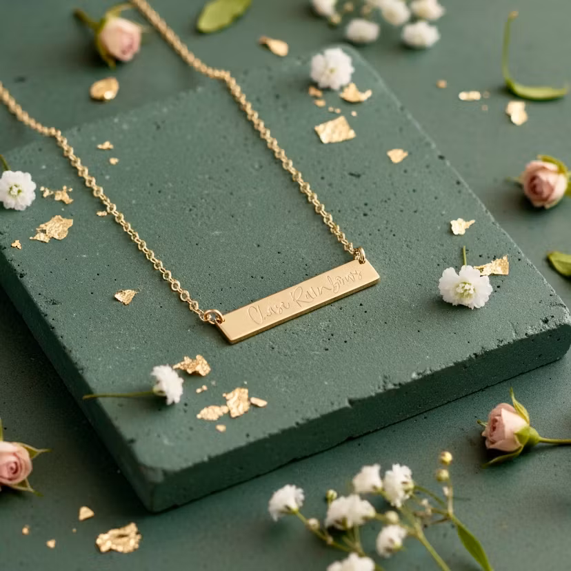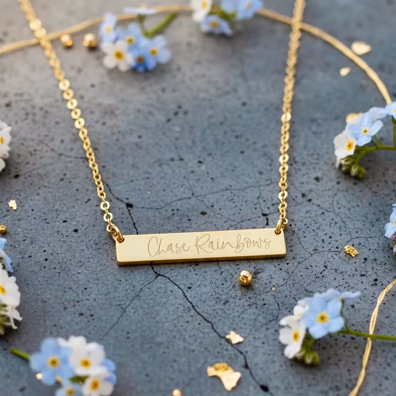 Gold necklace with "Chase Rainbows" engraved on the gold bar.