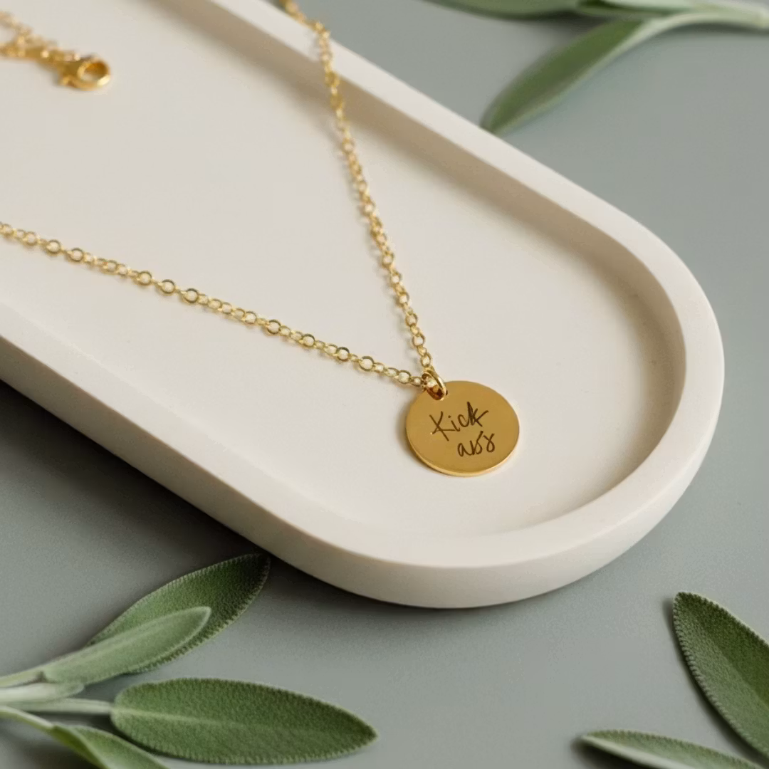 Gold necklace with "Kick Ass" engraved on the gold bar.